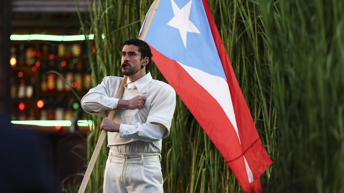 SANTA CLARA, CALIFORNIA - FEBRUARY 8: Bad Bunny performs in the Apple Music Halftime Show during the NFL Super Bowl 60 football game between the Seattle Seahawks and the New England Patriots, at Levi's Stadium on February 8, 2026 in Santa Clara, California. (Photo by Kevin Sabitus/Getty Images)